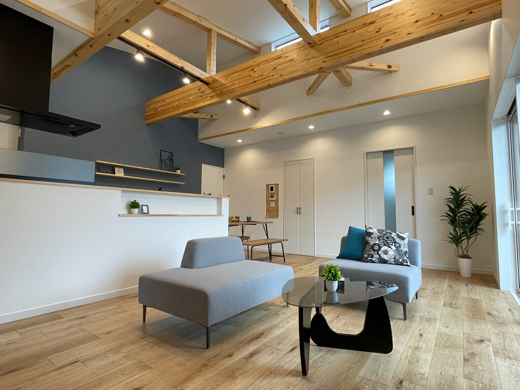 LDK・・・大きな吹き抜けにより圧倒的な開放感があります。一本ものの頑丈な梁は三友らしさが