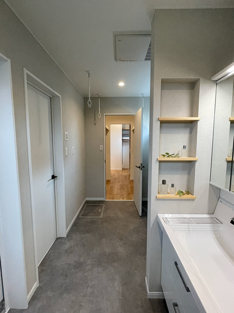 回遊動線・・・キッチン→洗面所→洗濯物干しスペース→WIC→パントリー→キッチンと回遊できる動