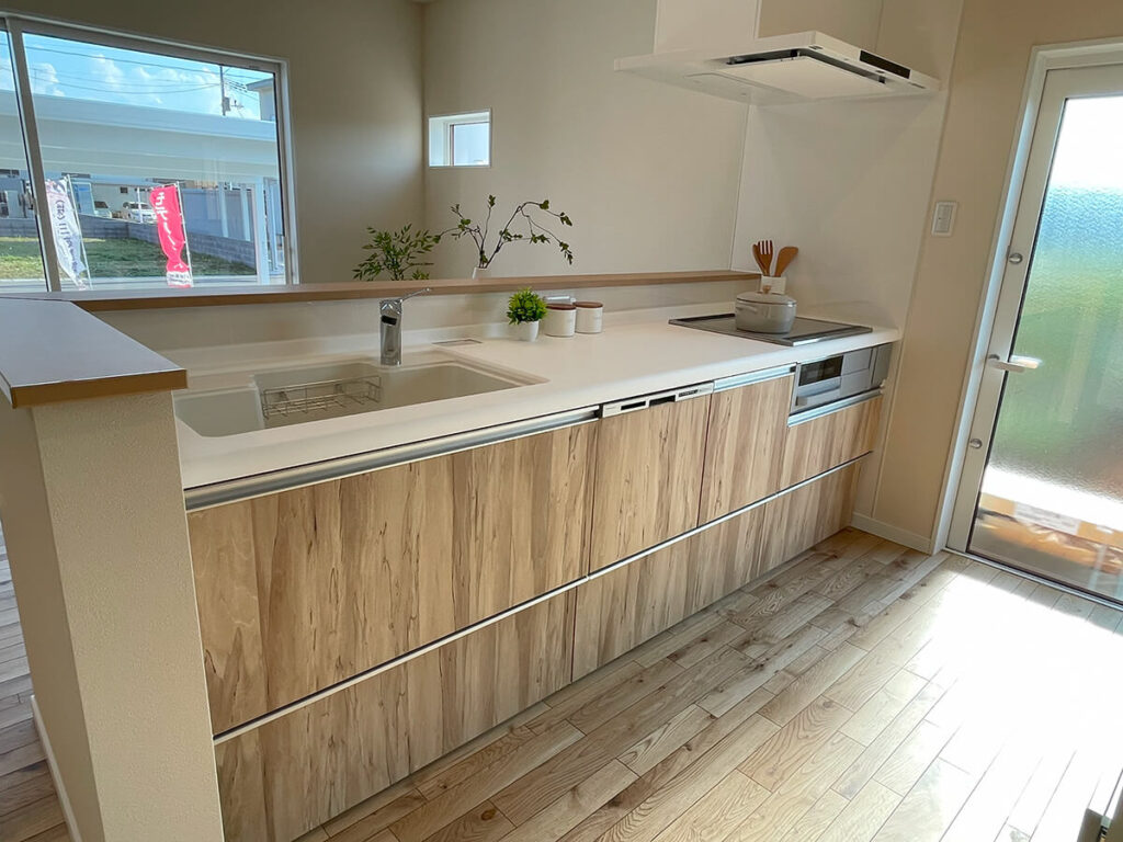 キッチン・・・家のテーマカラーでもある白とベージュを基調に、ナチュラルな雰囲気にまとめました。