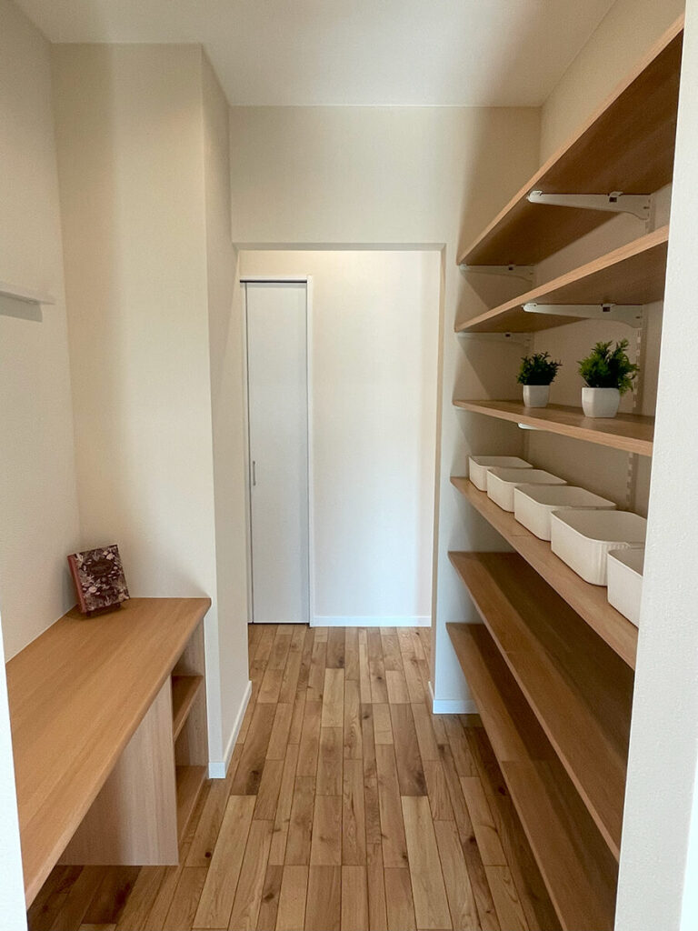 パントリー兼家事室・・・キッチンのすぐそばにあることで高い利便性を発揮します。食材はもちろん、ごちゃつきが